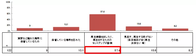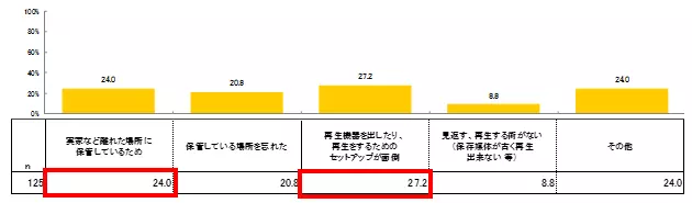 しかし、写真を紙で保存している人の約40%は、写真を見返すことが「ほとんどない」、「まったくない」状態にあり(グラフ②)、見返さない理由では「取り出すことが面倒」に次いで「実家など離れた場所に保管しているため」が2番目に多い理由として上がりました。(グラフ③)