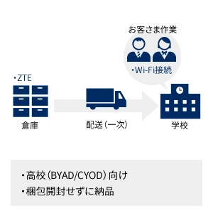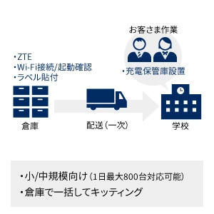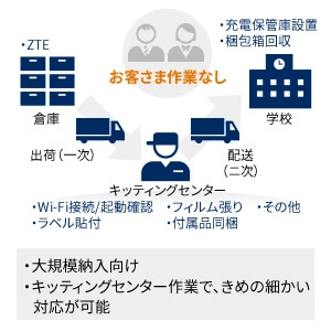 | 導入支援サービス(Chromebook) | デバイス登録(ZTE)* | 起動確認 | ラベル作成・貼付 | アセットIDシリアル紐づけ | MACアドレス抽出 | フィルム貼付 | 輸送(一次配送) | 輸送(二次配送) | 充電保管設置 | ACアダプタ交換設置 |