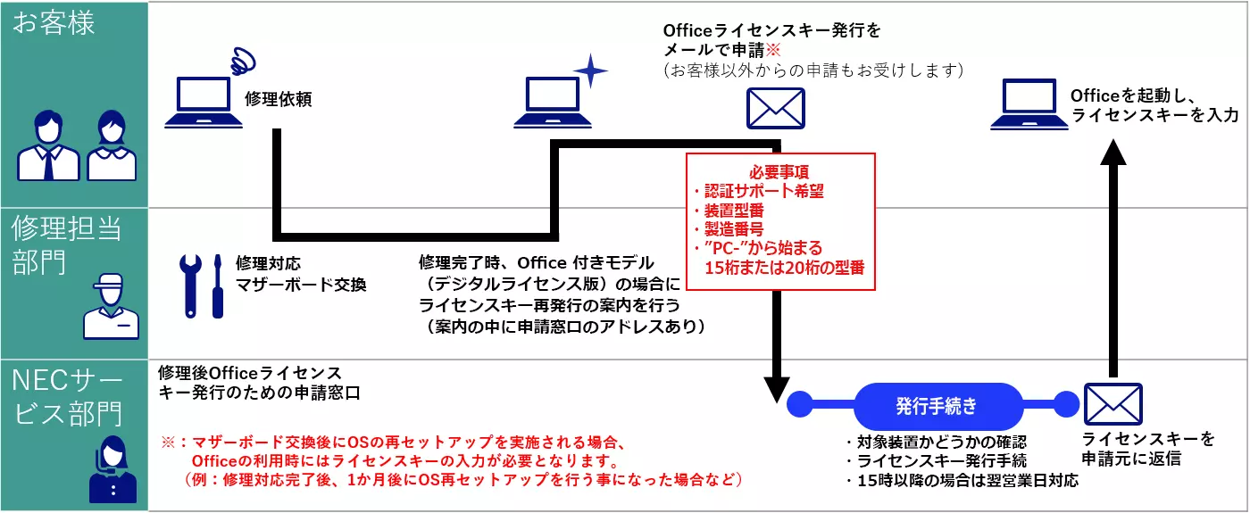 マザーボート交換などの修理完了後、お客様ご自身により、Officeの新しいライセンスキーを入手 いただく必要があります