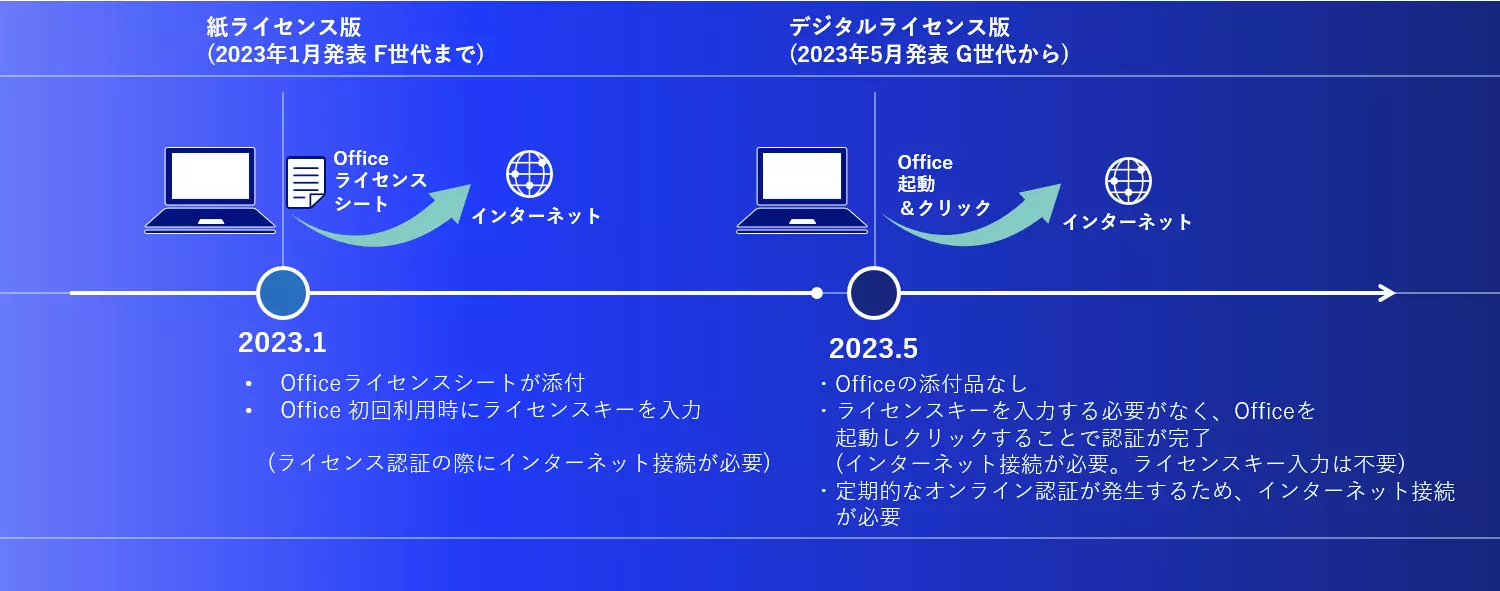 ビジネスPCの2023年5月商品(G世代)以降のセレクションメニューのOfficeについては、ライセンスが紙ライセンス版からデジタルライセンス版へ変更となります。