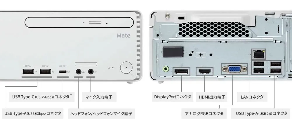USB 5Gbps(Type-C*)コネクタ×1を含む7つのUSBコネクタ(Type-C×1、Type-A×6)を装備。また、マイク入力端子・ヘッドフォン/ヘッドフォンマイク端子を前面に配置。Webミーティングに参加する際も、マイクなど周辺機器を接続するために立ち上がったり、背面まで手を伸ばす煩わしさがなく抜き差しを行えます。