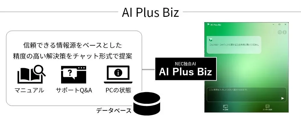 「AI Plus Biz」お客様の困りごとに対して、PCに関するノウハウのデータベースと、AIが取得したトラブル発生時のPCの状態をもとに、「AI Plus Biz」がチャット形式で具体的な解決策を提案します。
