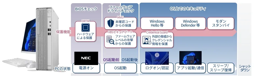「Secured-Core PC」に対応Secured-Core PCは、Microsoft社が提唱するセキュリティ要件です。この要件に対応したハードウェア、BIOS、ファームウェア及びOSによって、従来では防ぎきれなかったPC内部(ファームウェアやBIOS)への不正アクセスやデータの改ざんを防御する仕組みです。