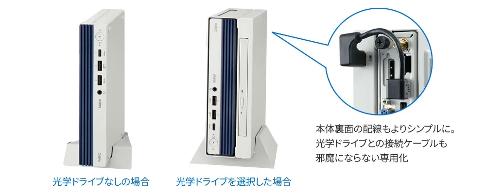 セレクションメニューで光学ドライブを選択した場合は、PC本体とUSB接続光学ドライブをセット状態にしてお届け。デスク上の設置時にも、さらに自由なスペースを確保できます。