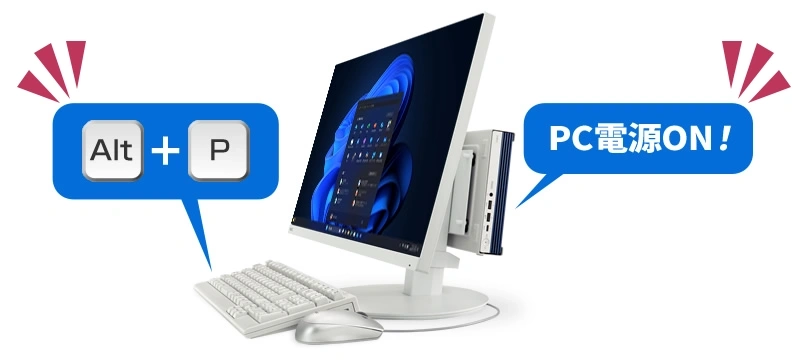 タイプMCでは、特定のUSBコネクタにキーボードを接続することで、[ALT] + [P]キーでのキーボードパワーオン機能に対応。卓上のお手元操作&ワンタッチでの電源ONが可能なため、コンパクトな本体の設置自由度がさらに向上します。
