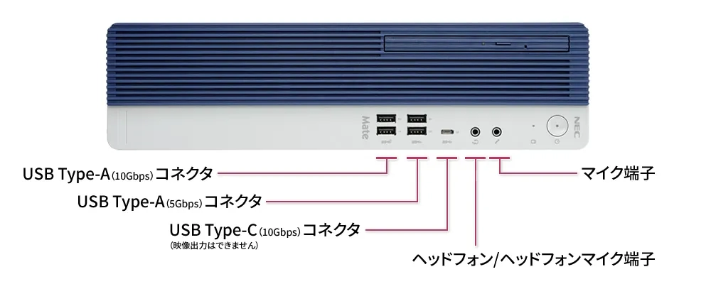USB 10Gbps(Type-C)コネクタを含む5つのUSBコネクタに加え、ヘッドフォン/ヘッドフォンマイク端子を前面に配置。Webミーティングに参加する際も、マイクなど周辺機器を接続するために立ち上がったり、背面まで手を伸ばす煩わしさがなく抜き差しを行えます。