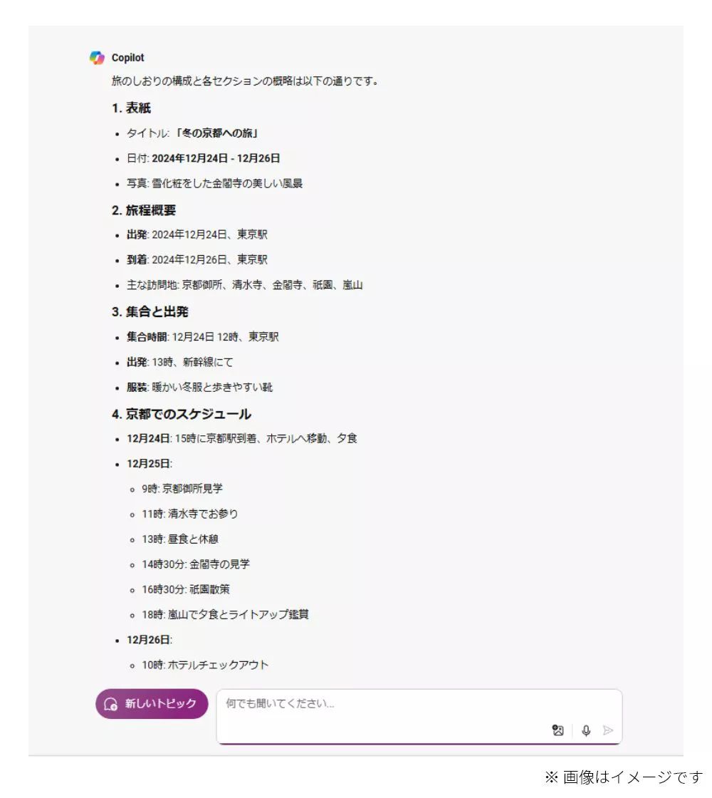 ④期待値:どのような対応を期待しているか 例えば「旅のしおり」を作るとして、以下のような質問をすると図のような回答が得られます。お手元のMicrosoft Copilotで実際にプロンプトを入力して結果をご覧ください。