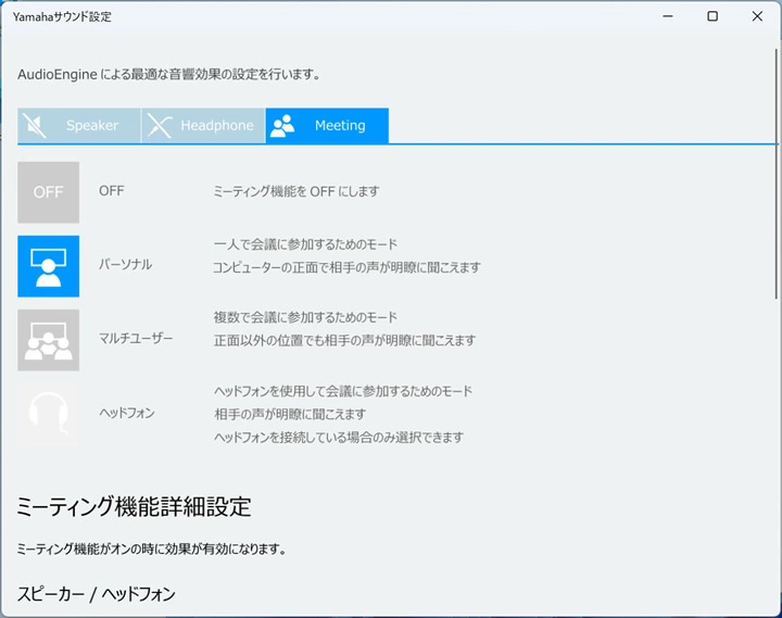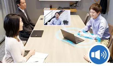 ミーティング機能は、Web会議時にユーザが「聞く」ための出力サウンドと相手側へ「伝える」ための入力サウンドの両面の音質を高める様々な機能で、ノイズの少ない聞き取りやすい音質を提供します。