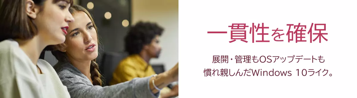 また、ハイブリッドワークに必要なセキュリティと管理機能を提供。Windows 10を基盤に構築されているので、アプリやツールの多くを継続して使用したり、展開やOSアップデートも慣れ親しんだWindows 10と同じように行えます。