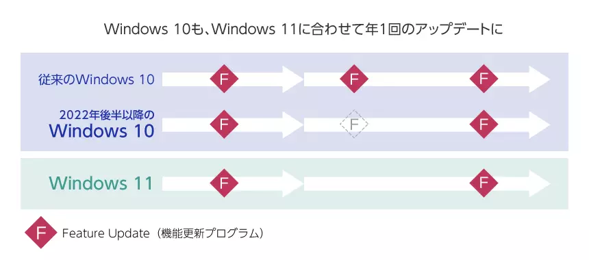 また、Windows 10ではこれまで年2回、Feature Update(機能更新プログラム)を配布されてきましたが、Windows 11の更新間隔にあわせて、年1回に変更されます。