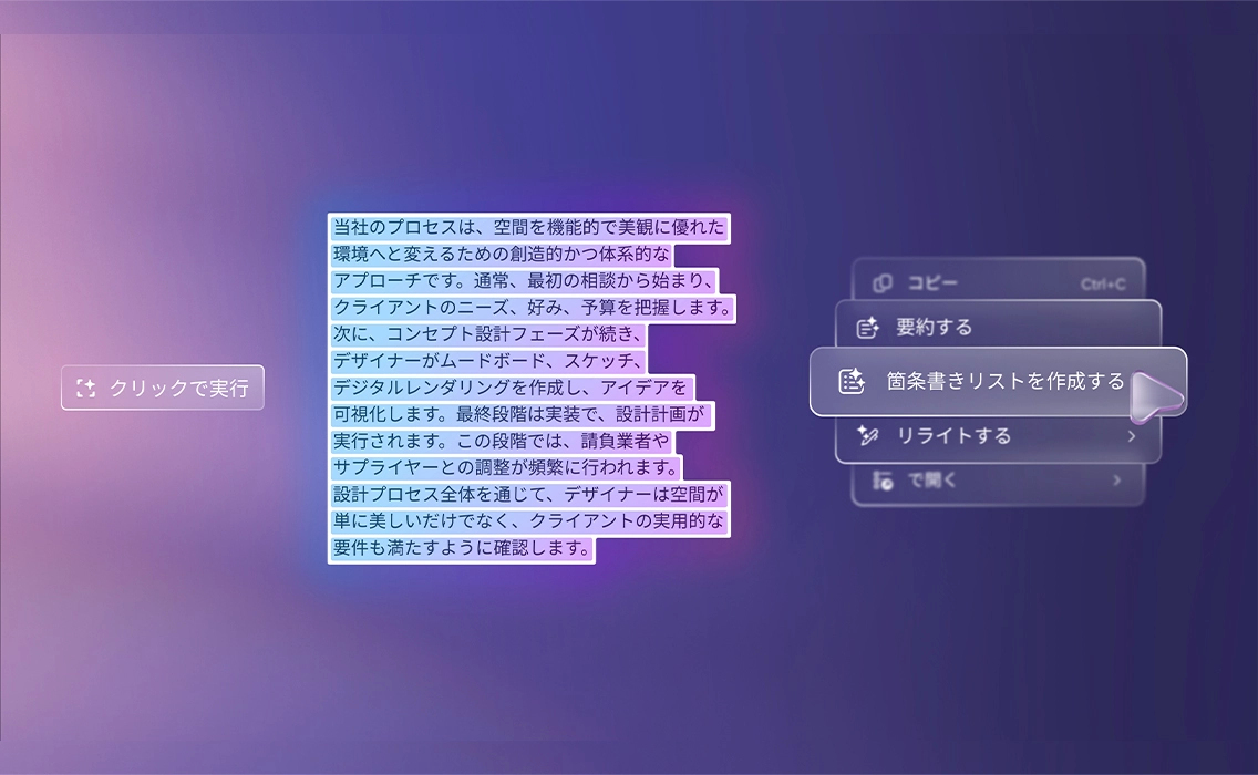 作業の流れを止めずに、画面上のテキストや画像を選択すると、Click to Do が次のステップを賢く提案します。