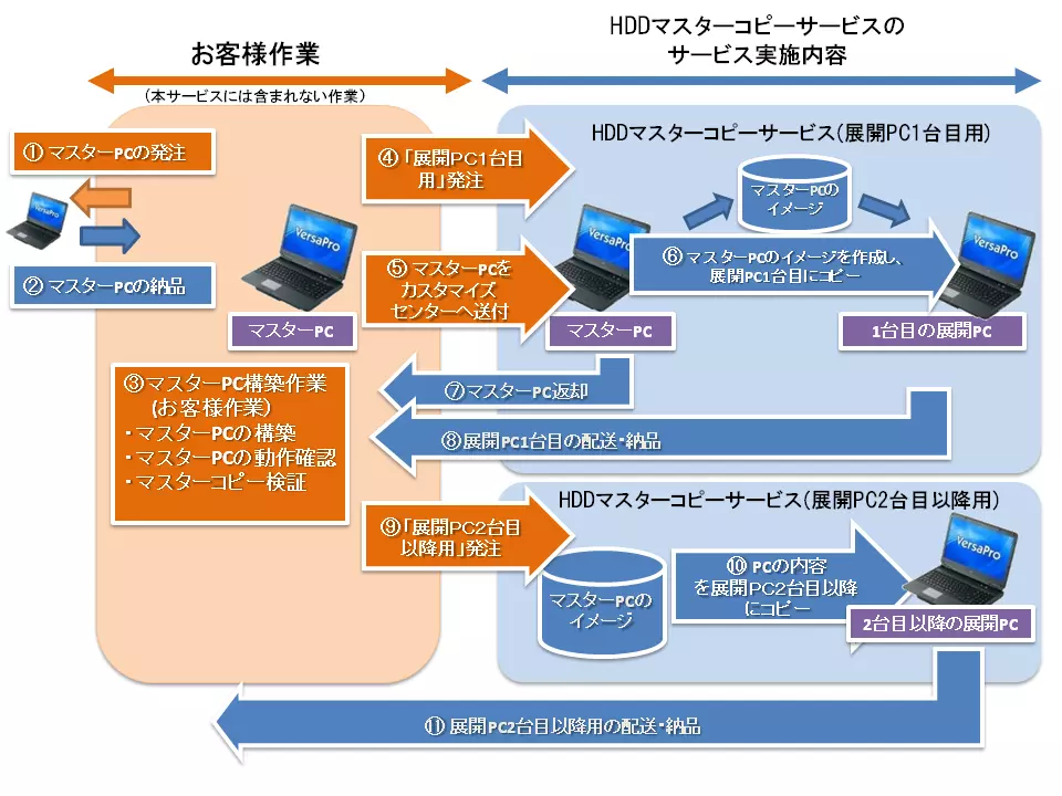 お客様にて、マスターとなるPCを作成いただき、そのHDDの内容(以下、「HDDイメージ」と表記します。)を同一機種に展開いたします。HDDイメージは、適用対象となる機種の受注(出荷)停止まで保管しているため、PCの大規模展開時の分割納入や標準PC商談等、都度発注の本体で採用頂くと利便性が高いサービスとなります。