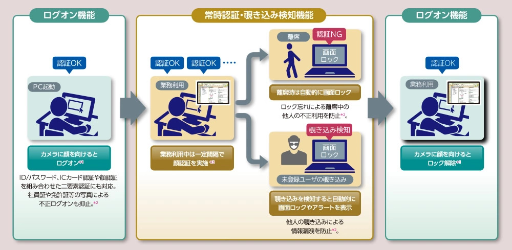 ログオン後、一定間隔*で顔認証を行います。常時認証機能により利用者の離席時は認証NGとなり自動的に画面をロック。覗き込み検知機能により未登録ユーザを検知の際は自動的に画面ロックやアラート表示を行います。