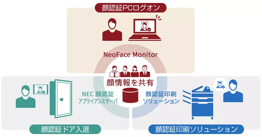 NeoFace Monitorで利用中の顔画像を入退室や印刷のNEC製顔認証製品に利用することが可能です。