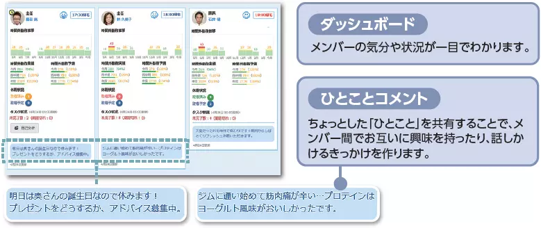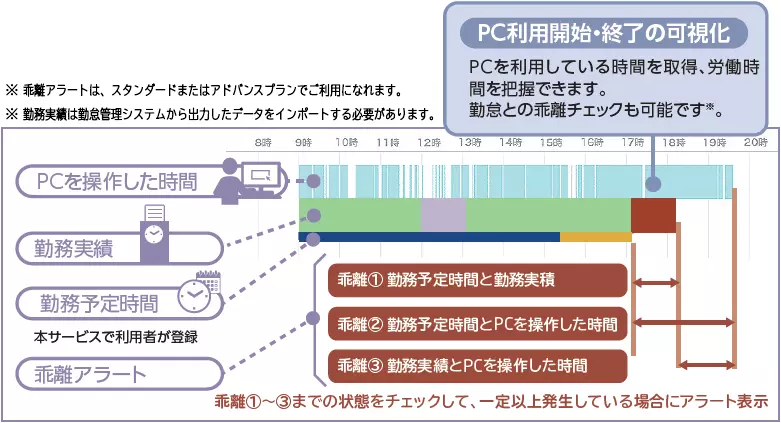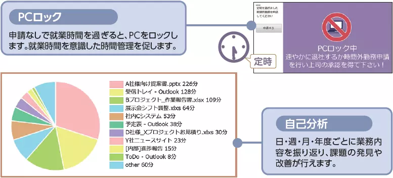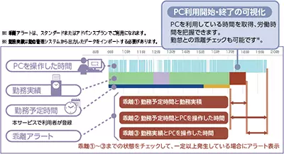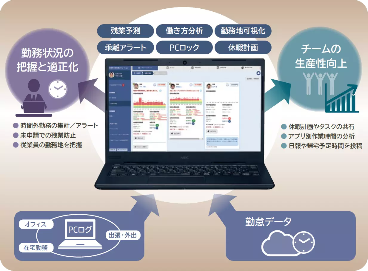 PC 利用状況や勤怠状況などから働き方を見える化。社員一人ひとりの意識改革と「関係の質」の向上を支援します。