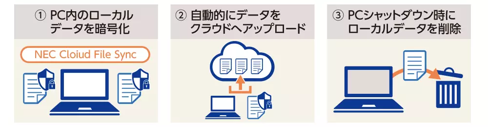 ご利用のPCのデータを自動・リアルタイムでクラウドへ仮想化。PCシャットダウン時にはローカルからデータが削除され、セキュリティを確保します。