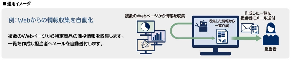パソコン上の操作や作業をソフトウェアロボットに記憶させ、業務を自動化。人とロボットが協働する、新しい業務オペレーションをご提案します。