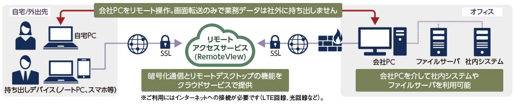 自宅や外出先から、会社PCへセキュアにアクセスして遠隔操作することが可能です。