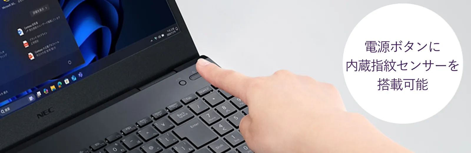 Windows Helloに対応した内蔵指紋センサー*を電源ボタンに搭載可能。パスワード入力のかわりに指でタッチするだけで、すばやくOSにログオンできます。