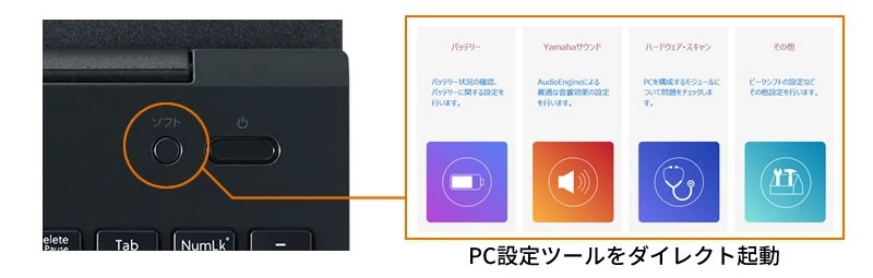 電源ボタンの隣にはWebミーティングモードや省電力設定を1ボタンで呼び出し可能な「ソフトキー」を装備。