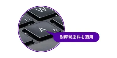 耐摩耗の塗料を適用し、印字がはがれにくい設計。キーボードの文字が読みにくくなることを防ぎます。