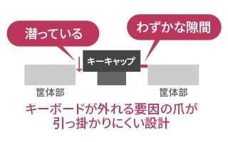 キーキャップと筐体の隙間を狭くし、かつキーキャップ下部を潜らせているため操作時に指の爪などがキーキャップに引っかかりにくい設計。