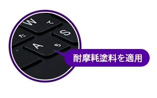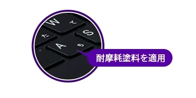 耐摩耗の塗料を適用し、印字がはがれにくい設計。キーボードの文字が読みにくくなることを防ぎます。