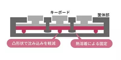 キーボードをサポートする板金部分に凸形状を設け沈み込みを軽減。