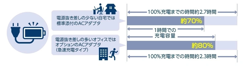 長時間のバッテリー駆動&急速充電ACアダプタ追加導入で