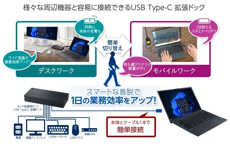 加えて、セレクションメニューまたは別売のUSB Type-C 拡張ドックを使用すればより多くの周辺機器との接続が可能になります。