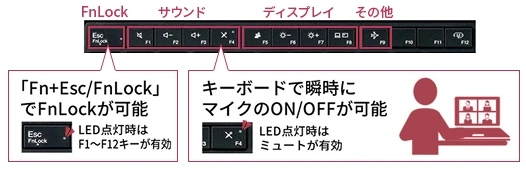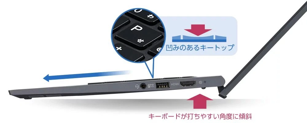 アイソレーションキーボードを採用ゆとりある19mmのキーピッチを採用。キートップの形状は真ん中に向かって凹んでいて、隣のキーを間違って押下するのを防ぐシリンドリカル形状。1.5mmのキーストロークと大き目のキーサイズ、心地よい感触と摩耗への耐久性強化を両立するプレミアムUVコーティングなど打ちやすさのための工夫に加え、耳障りな打鍵音をカットするキーボードを搭載。よく使われるPrtSc(全画面キャプチャ)をメインキーにするなど、Fnキーの配列も変更しました。また、ディスプレイを開くことでキーボードが打ちやすい角度に傾斜する機構も備えています。さらに、ミーティング機能切り替えを〈F5〉に、マイクミュート機能を〈F4〉に割り当て、「ミーティングモード」使用時の操作性にも配慮しています。