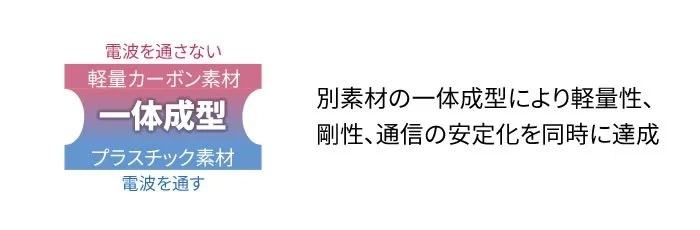 本体の底面部分は軽量なカーボンとプラスチックを一体成型することで、薄型フラットデザインと耐久性、通信品質の安定化を同時に達成。
