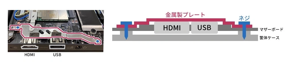 ※ネジは金属製プレートと筐体のケースで固定する「とも締め方式」を採用。負荷が基盤にはかからないようにインターフェイスを固定。