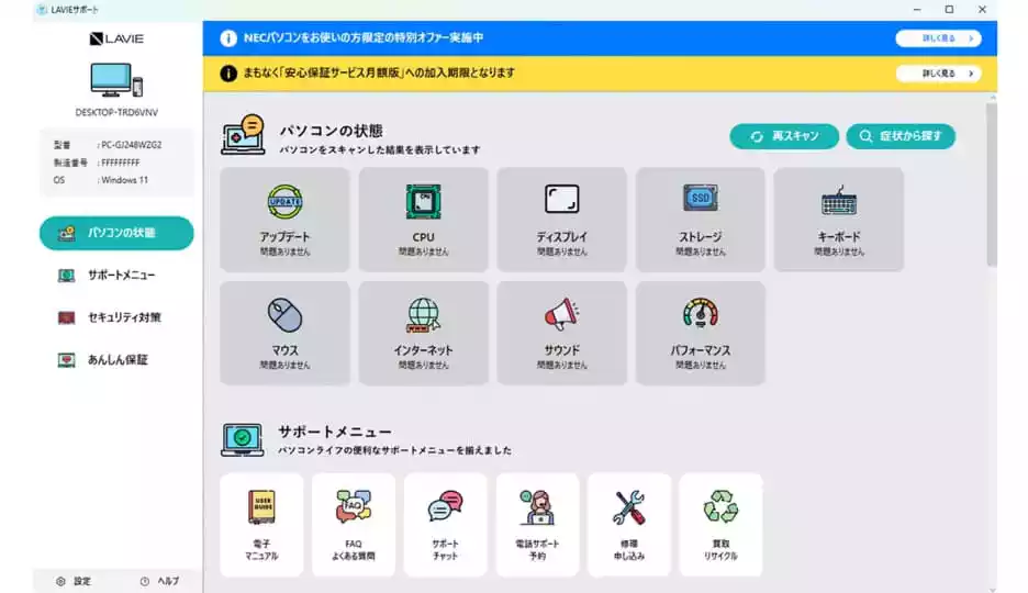 LAVIEサポートはお使いのPCのトラブルの解決を手助けするアプリケーションです。スキャン結果を一覧で確認でき、パソコンの健康状態が一目でわかります。