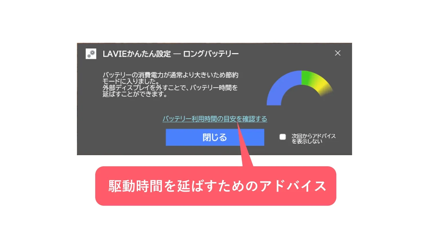 さらに、接続中の周辺機器や長時間起動したままのアプリを検知し、バッテリー節約のためのアドバイスを行います。