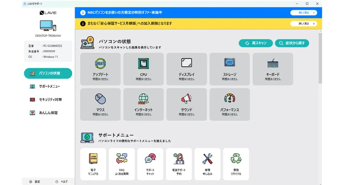 LAVIEサポートはお使いのパソコンのトラブル解決を手助けするアプリです。スキャン結果を一覧で確認でき、パソコンの健康状態が一目でわかります。