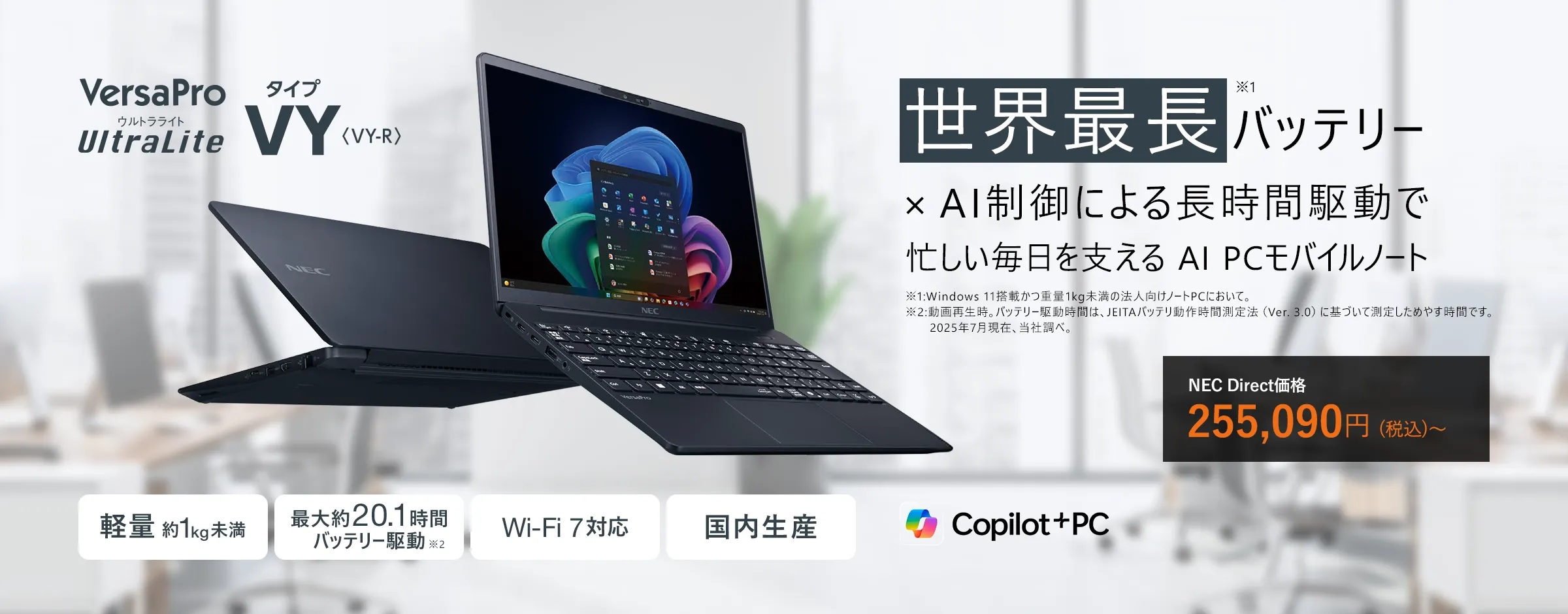 Windows 11搭載かつ1kg未満の法人向けノートPCにおいて。バッテリー(L)搭載時、JEITA3.0に基づいて測定したバッテリ駆動時間での比較。2025年7月現在、当社調べ。