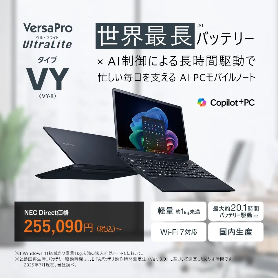 Microsoft社が提唱する「Copilot+ PC」に準拠。さらに、ハードウェア保全に役立つNECPC独自AIソリューション「AI Plus Biz」を搭載。